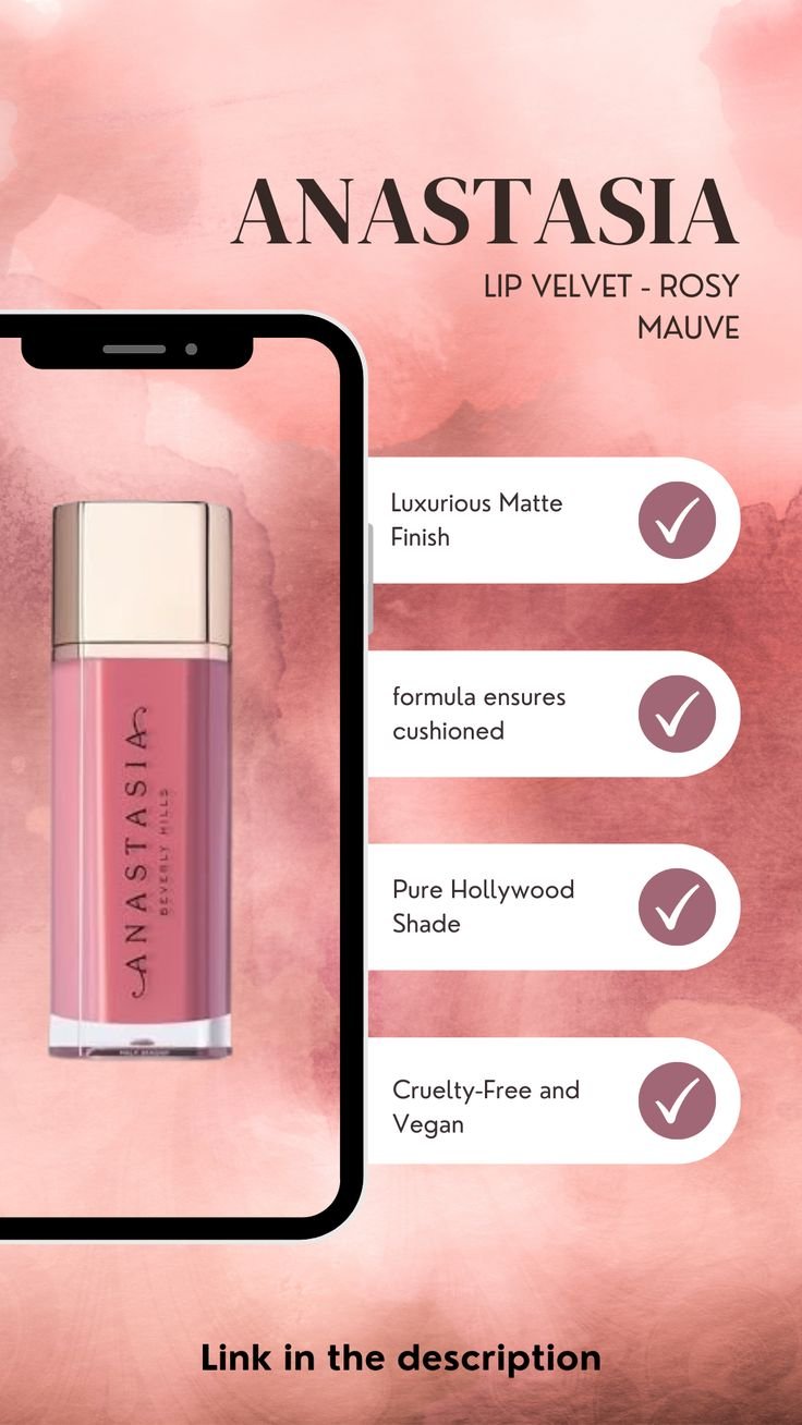 Anastasia Beverly Hills Lip Velvet is a velvet-smooth lip mousse with weightless, full pigment, true-matte color, cushioned, comfortable wear, and a smoothing lip finish that allows you to line and apply with a multifunctional, teardrop-shaped cushioned wand.